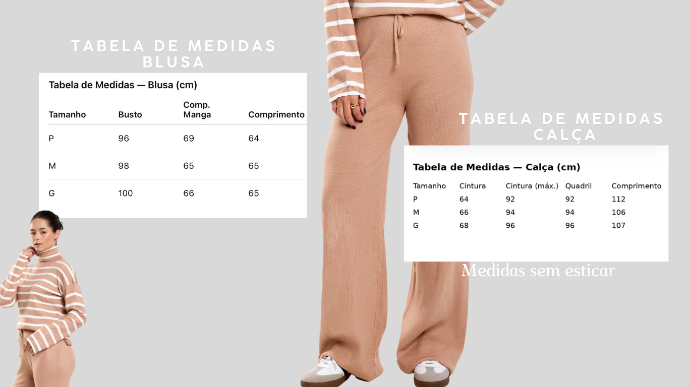 Conjunto em tricot com toque macio e caimento leve. Blusa de gola alta com listras horizontais em contraste, modelagem solta e mangas retas. Calça pantalona de cintura alta com elástico e cordão não ajustável , proporcionando conforto e alongamento da silhueta.